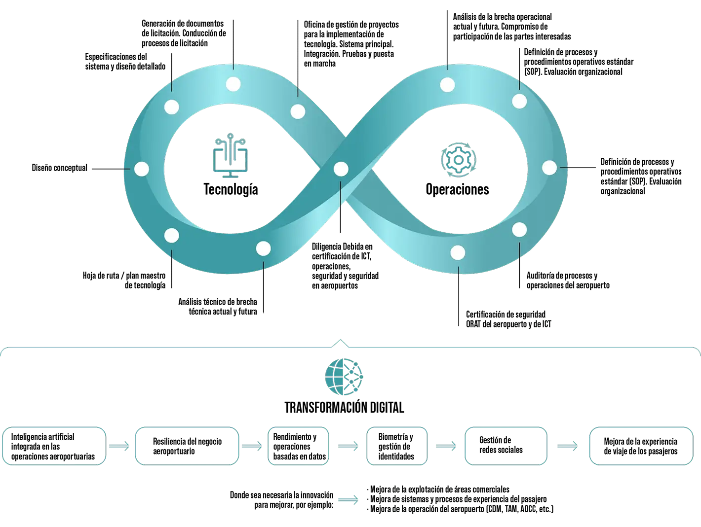 Concentramos nuestros servicios en tres áreas en las que nuestro equipo posee una amplia experiencia: soporte tecnológico, operaciones y transformación digital. Estas tres áreas contribuyen a una actividad aeroportuaria segura y fluida.